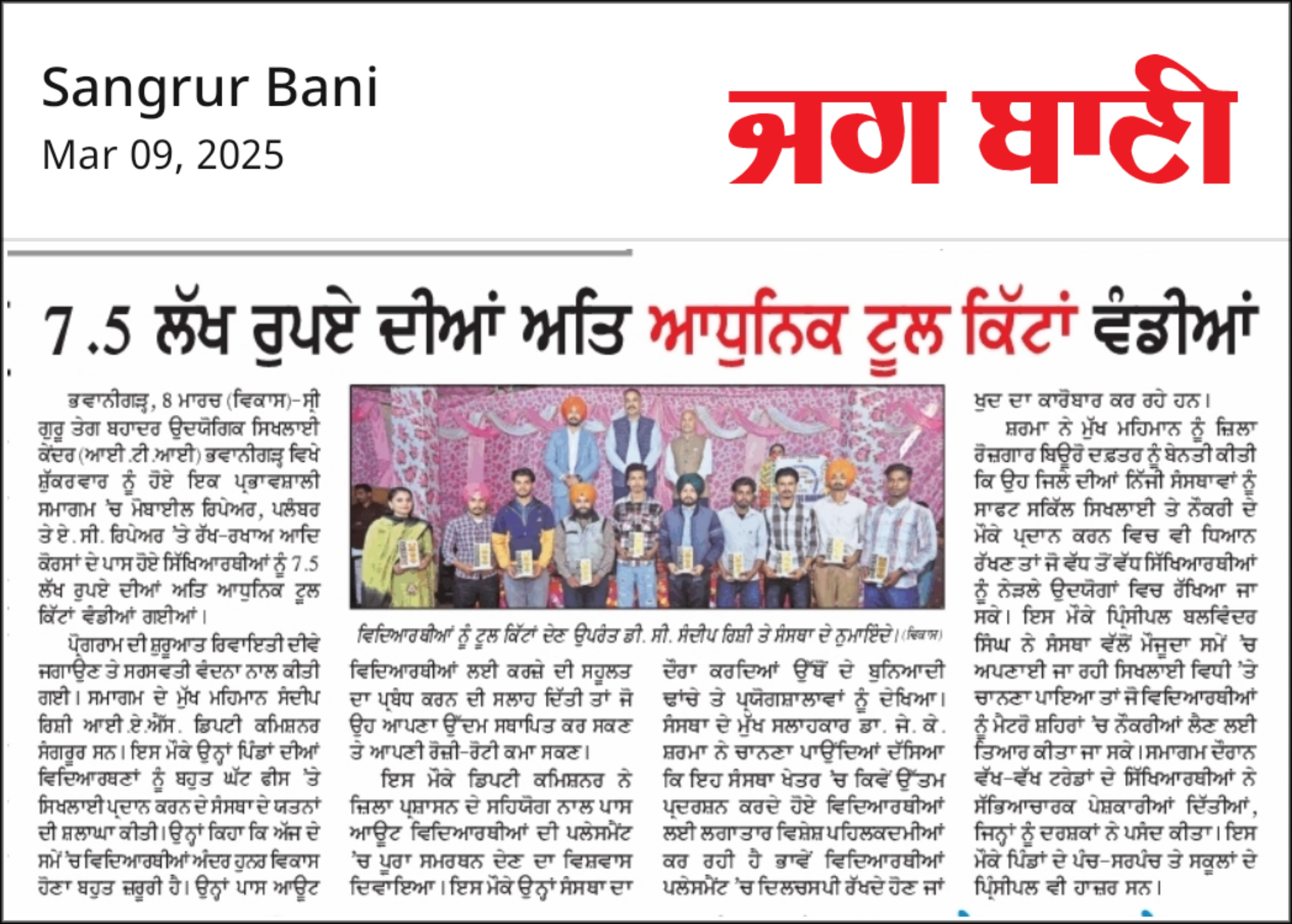 ਅੱਜ ਸ਼੍ਰੀ ਗੁਰੂ ਤੇਗ ਬਹਾਦਰ ਉਦਯੋਗਿਕ ਸਿਖਲਾਈ ਕੇਂਦਰ ਭਵਾਨੀਗੜ੍ਹ ਵਿਖੇ ਹੋਏ ਇੱਕ ਪ੍ਰਭਾਵਸ਼ਾਲੀ ਸਮਾਗਮ ਵਿੱਚ, ਮੋਬਾਈਲ ਰਿਪੇਅਰ, ਪਲੰਬਰ ਅਤੇ ਏਸੀ ਰਿਪੇਅਰ ਅਤੇ ਰੱਖ-ਰਖਾਅ ਕੋਰਸਾਂ ਦੇ ਪਾਸ ਆਊਟ ਸਿਖਿਆਰਥੀਆਂ ਨੂੰ 7.5 ਲੱਖ ਰੁਪਏ ਦੇ ਅਤਿ-ਆਧੁਨਿਕ ਟੂਲ ਕਿੱਟਾਂ ਵੰਡੀਆਂ ਗਈਆਂ। ਪ੍ਰੋਗਰਾਮ ਦੀ ਸ਼ੁਰੂਆਤ ਰਵਾਇਤੀ ਦੀਵੇ ਜਗਾਉਣ ਅਤੇ ਸਰਸਵਤੀ ਵੰਦਨਾ ਨਾਲ ਹੋਈ। ਇਸ ਪ੍ਰੋਗਰਾਮ ਵਿੱਚ ਨੇੜਲੇ ਪਿੰਡਾਂ ਦੇ 15 ਤੋਂ ਵੱਧ ਪਿੰਡਾਂ ਦੇ ਸਰਪੰਚ ਅਤੇ ਸਕੂਲ ਪ੍ਰਿੰਸੀਪਲ ਵੀ ਸ਼ਾਮਲ ਹੋਏ।