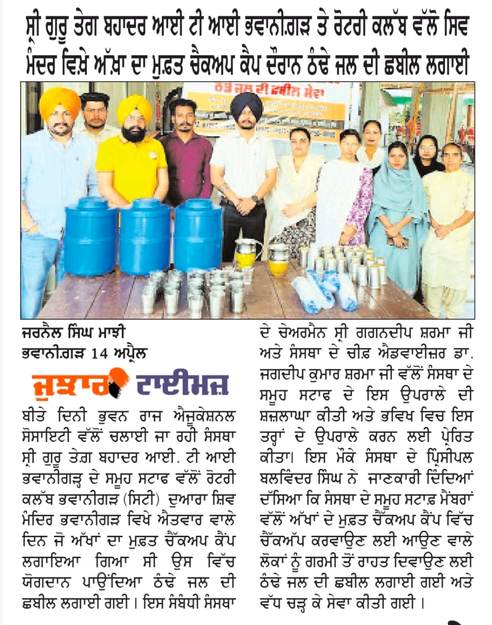 ਬੀਤੇ ਦਿਨੀ ਭੁਵਨ ਰਾਜ ਐਜੂਕੇਸ਼ਨਲ ਸੋਸਾਇਟੀ ਵੱਲੋਂ ਚਲਾਈ ਜਾ ਰਹੀ ਸੰਸਥਾ ਸ੍ਰੀ ਗੁਰੂ ਤੇਗ਼ ਬਹਾਦਰ ਆਈ. ਟੀ ਆਈ ਭਵਾਨੀਗੜ੍ਹ ਦੇ ਸਮੂਹ ਸਟਾਫ ਵੱਲੋਂ ਰੋਟਰੀ ਕਲੱਬ ਭਵਾਨੀਗੜ (ਸਿਟੀ) ਦੁਆਰਾ ਸ਼ਿਵ ਮੰਦਿਰ ਭਵਾਨੀਗੜ ਵਿਖੇ ਐਤਵਾਰ ਵਾਲੇ ਦਿਨ ਜੋ ਅੱਖਾਂ ਦਾ ਮੁਫ਼ਤ ਚੈੱਕਅਪ ਕੈਂਪ ਲਗਾਇਆ ਗਿਆ ਸੀ ਉਸ ਵਿੱਚ ਯੋਗਦਾਨ ਪਾਉਂਦਿਆ ਠੰਢੇ ਜਲ ਦੀ ਛਬੀਲ ਲਗਾਈ ਗਈ । ਇਸ ਸੰਬੰਧੀ ਸੰਸਥਾ ਦੇ ਚੇਅਰਮੈਨ ਸ੍ਰੀ ਗਗਨਦੀਪ ਸ਼ਰਮਾ ਜੀ ਅਤੇ ਸੰਸਥਾ ਦੇ ਚੀਫ਼ ਐਡਵਾਈਜ਼ਰ ਡਾ. ਜਗਦੀਪ ਕੁਮਾਰ ਸ਼ਰਮਾ ਜੀ ਵੱਲੋਂ ਸੰਸਥਾ ਦੇ ਸਮੂਹ ਸਟਾਫ ਦੇ ਇਸ ਉਪਰਾਲੇ ਦੀ ਸ਼ਲਾਘਾ ਕੀਤੀ ਅਤੇ ਭਵਿਖ ਵਿਚ ਇਸ ਤਰ੍ਹਾਂ ਦੇ ਉਪਰਾਲੇ ਕਰਨ ਲਈ ਪ੍ਰੇਰਿਤ ਕੀਤਾ। ਇਸ ਮੌਕੇ ਸੰਸਥਾ ਦੇ ਪ੍ਰਿੰਸੀਪਲ ਬਲਵਿੰਦਰ ਸਿੰਘ ਨੇ ਜਾਣਕਾਰੀ ਦਿੰਦਿਆਂ ਦੱਸਿਆ ਕਿ ਸੰਸਥਾ ਦੇ ਸਮੂਹ ਸਟਾਫ਼ ਮੈਂਬਰਾਂ ਵੱਲੋਂ ਅੱਖਾਂ ਦੇ ਮੁਫ਼ਤ ਚੈੱਕਅਪ ਕੈਂਪ ਵਿੱਚ ਚੈੱਕਅੱਪ ਕਰਵਾਉਣ ਲਈ ਆਉਣ ਵਾਲੇ ਲੋਕਾਂ ਨੂੰ ਗਰਮੀ ਤੋਂ ਰਾਹਤ ਦਿਵਾਉਣ ਲਈ ਠੰਢੇ ਜਲ ਦੀ ਛਬੀਲ ਲਗਾਈ ਗਈ ਅਤੇ ਵੱਧ ਚੜ੍ਹ ਕੇ ਸੇਵਾ ਕੀਤੀ ਗਈ ।