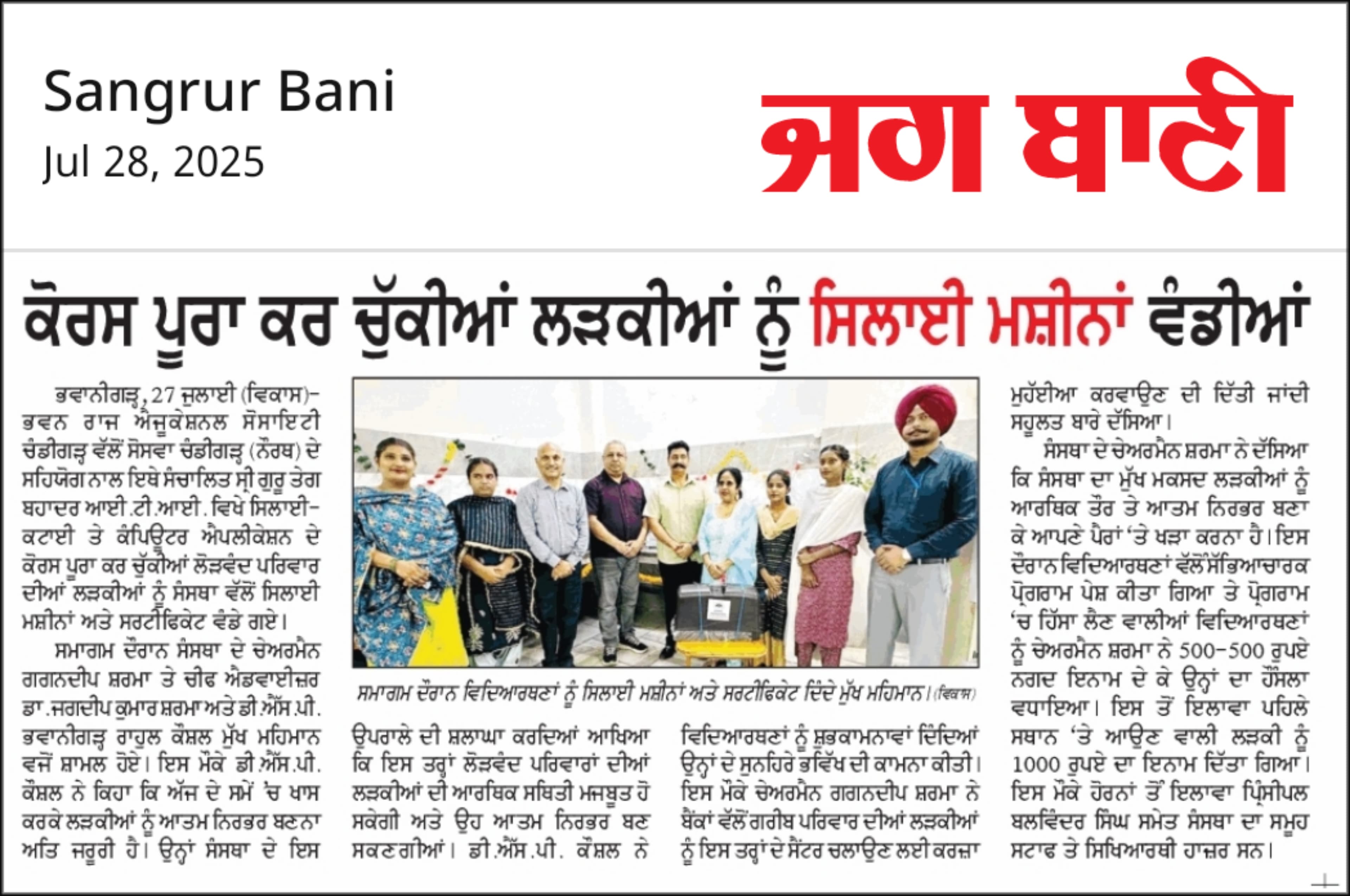 ਭਵਨ ਰਾਜ ਐਜੂਕੇਸ਼ਨਲ ਸੁਸਾਇਟੀ ਚੰਡੀਗੜ੍ਹ ਵੱਲੋਂ ਸੋਸਵਾ ਚੰਡੀਗੜ੍ਹ (ਨੌਰਥ) ਦੀ ਮਦਦ ਨਾਲ ਸ੍ਰੀ ਗੁਰੂ ਤੇਗ ਬਹਾਦਰ ਆਈ.ਟੀ. ਆਈ. ਭਵਾਨੀਗੜ੍ਹ ਵਿਖੇ ਚਲਾਏ ਜਾ ਰਹੇ ਸਿਲਾਈ- ਕਟਾਈ ਅਤੇ ਕੰਪਿਊਟਰ ਐਪਲੀਕੇਸ਼ਨ ਦੇ ਕੋਰਸ ਨੂੰ ਪੂਰਾ ਕਰ ਚੁੱਕੀਆਂ ਲੋੜਵੰਦ ਪਰਿਵਾਰ ਦੀਆਂ ਲੜਕੀਆਂ ਨੂੰ ਸੰਸਥਾ ਵੱਲੋਂ ਸਿਲਾਈ ਮਸ਼ੀਨਾਂ ਅਤੇ ਸਰਟੀਫਿਕੇਟ ਵੰਡੇ ਗਏ। ਸੰਸਥਾ ਦੇ ਚੇਅਰਮੈਨ ਸ਼੍ਰੀ ਗਗਨਦੀਪ ਸ਼ਰਮਾ ਜੀ ਅਤੇ ਚੀਫ ਐਡਵਾਈਜ਼ਰ ਡਾਕਟਰ ਜਗਦੀਪ ਕੁਮਾਰ ਸ਼ਰਮਾ ਜੀ ਦੀ ਅਗਵਾਈ ਵਿੱਚ ਡੀ.ਐਸ.ਪੀ .ਸ੍ਰੀ ਰਾਹੁਲ ਕੌਸ਼ਲ, ਭਵਾਨੀਗੜ੍ਹ ਮੁੱਖ ਮਹਿਮਾਨ ਵਜੋਂ ਸ਼ਾਮਿਲ ਹੋਏ। ਡੀ.ਐਸ.ਪੀ. ਸ਼੍ਰੀ ਰਾਹੁਲ ਕੌਸਲ ਜੀ ਨੇ ਕਿਹਾ ਕਿ ਅੱਜ ਦੇ ਯੁੱਗ ਵਿੱਚ ਇਸ ਤਰ੍ਹਾਂ ਦੇ ਸੈਂਟਰ ਬਹੁਤ ਜਰੂਰੀ ਹਨ ਤਾਂ ਜੋ ਗਰੀਬ ਪਰਿਵਾਰ ਦੀਆਂ ਲੜਕੀਆਂ ਦੀ ਆਰਥਿਕ ਸਥਿਤੀ ਮਜਬੂਤ ਹੋ ਸਕੇ। ਡੀ.ਐਸ.ਪੀ. ਸ਼੍ਰੀ ਰਾਹੁਲ ਕੌਸ਼ਲ ਜੀ ਨੇ ਸੰਸਥਾ ਦੇ ਇਸ ਕਾਰਜ ਦੀ ਸਲਾਘਾ ਕੀਤੀ ਉਹਨਾਂ ਨੇ ਕਿਹਾ ਕਿ ਸੰਸਥਾ ਲੜਕੀਆਂ ਦੀ ਆਰਥਿਕ ਸਥਿਤੀ ਮਜ਼ਬੂਤ ਕਰਨ ਲਈ ਬਹੁਤ ਵਧੀਆ ਉਪਰਾਲਾ ਕਰ ਰਹੀ ਹੈ।